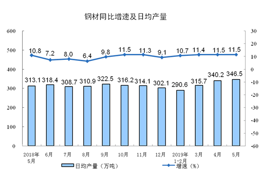 國家統(tǒng)計局數(shù)據(jù)顯示:2019年5月我國粗鋼日均產(chǎn)量287.4萬噸,5月生鐵日均產(chǎn)量232.9萬噸,5月鋼材日均產(chǎn)量346.5萬噸。