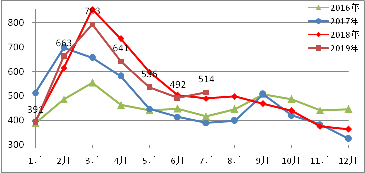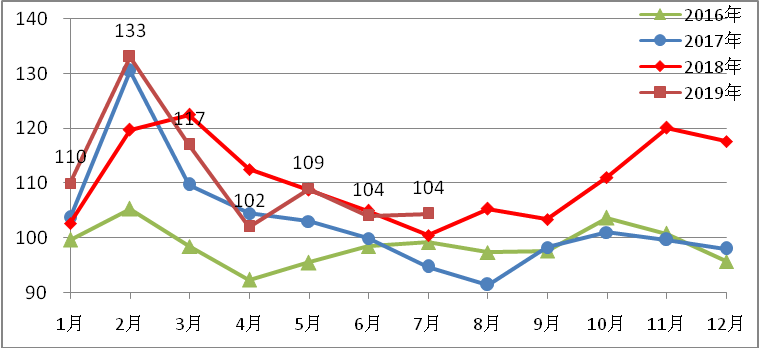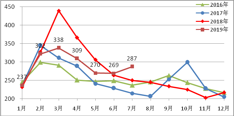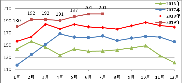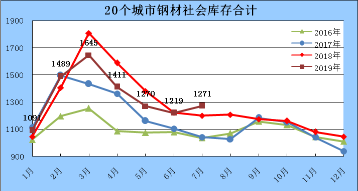 2019年7月,全國20個城市5大類品種鋼材社會庫存合計環比有所增加,且5個品種均有不同程度回升。本月庫存總量1271萬噸,環比增加52萬噸,上升4.3%;其中鋼材市場庫存總量1185萬噸,環比增加54萬噸,上升4.8%,港口庫存86萬噸,環比減少2萬噸,下降2.0%。具體見圖1、圖2、圖3。