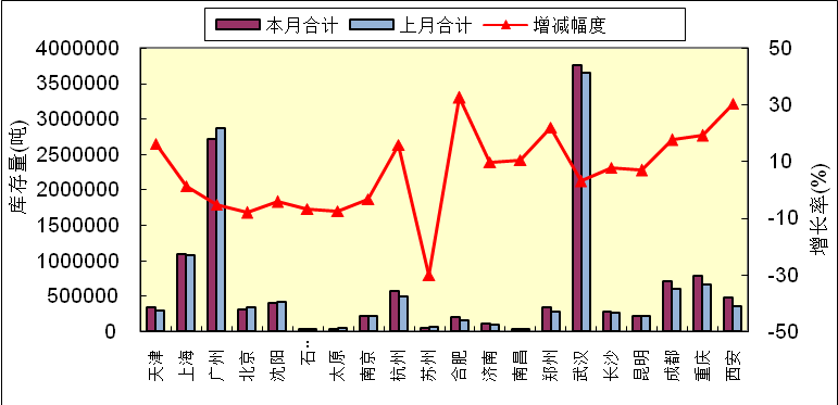 本月螺紋鋼庫存環比增加的地區有14個,其中增加較多的地區有天津,庫存環比增加1.6萬噸,其中鋼材市場增加1.4萬噸,港口增加0.2萬噸;上海庫存環比增加1.8萬噸,全部為鋼材市場增加量;杭州庫存環比增加3.9萬噸,合肥5.0萬噸,濟南0.5萬噸,鄭州3.6萬噸,武漢5.0萬噸,長沙1.8萬噸,昆明1.0萬噸,成都3.5萬噸,重慶4.5萬噸,西安7.8萬噸;本月庫存環比減少的地區有6個,其中減少較多的地區有廣州,庫存環比減少11.2萬噸,其中鋼材市場減少10.2萬噸,港口庫存減少1.0萬噸;北京庫存環比減少3.0萬噸,沈陽0.8萬噸,石家莊0.1萬噸,南京0.8萬噸,蘇州2.1萬噸。