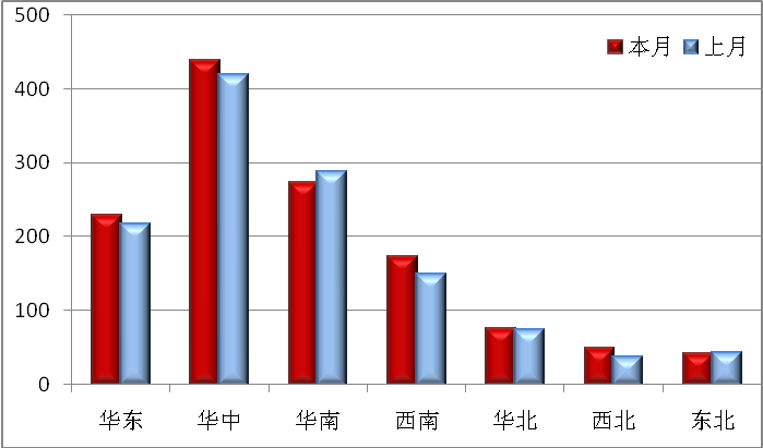 本月中厚板庫存環比增加的地區有10個,其中庫存增加較多的地區有天津,庫存環比增加0.3萬噸,其中鋼材市場減少0.1萬噸,港口增加0.4萬噸;南京庫存環比增加0.1萬噸,合肥0.2萬噸,南昌0.1萬噸,鄭州0.1萬噸,長沙0.1萬噸,成都1.8萬噸,重慶0.9萬噸,西安0.4萬噸;中厚板庫存環比減少的地區有7個,其中減少較多的地區有廣州,庫存環比減少2.5萬噸,其中鋼材市場減少0.5萬噸,港口減少2.0萬噸;沈陽庫存環比減少0.1萬噸,石家莊0.1萬噸,太原0.1萬噸,武漢0.3萬噸,昆明0.2萬噸。