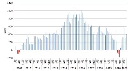 2.全年進口總量同比很難大幅增長。在鋼鐵行業(yè)利潤處于近年來較高水平的情況下,2021上半年我國鋼材進口量較2020上半年基本持平,較2020下半年大幅回落43%。2020年我國鋼材進口量激增始于6月份,6-11月單月進口量達到223萬噸,高基數效應下2021年我國鋼材進口量同比很難大幅增長。從影響因素來看,去年導致中國鋼材、鋼坯進口量大幅增長的主要因素均已悄然發(fā)生改變:一是,中國鋼鐵需求保持強勁,但海外供應缺口更為嚴峻;二是,國際鋼價隨著需求的復蘇漲幅明顯超過國內,進口資源成本顯著提升,去年階段性進出口價格倒掛已不復存在,上述變化均不利于國內鋼材進口保持高速增長。