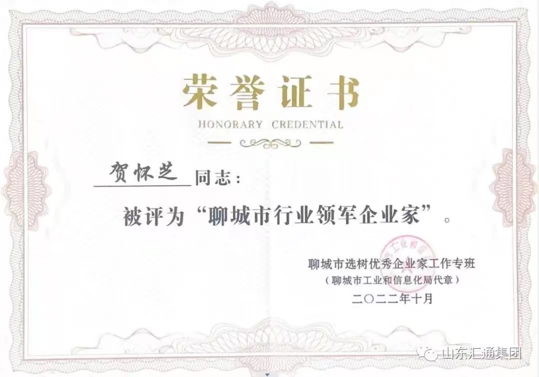 近日,由聊城市委組織部、市委統(tǒng)戰(zhàn)部、市工業(yè)和信息化局、市人力資源和社會(huì)保障局、市國有資產(chǎn)監(jiān)督管理委員聯(lián)合舉辦的聊城市優(yōu)秀企業(yè)家評(píng)選活動(dòng)中,匯通集團(tuán)董事長賀懷芝榮獲聊城市“行業(yè)領(lǐng)軍企業(yè)家”稱號(hào)。